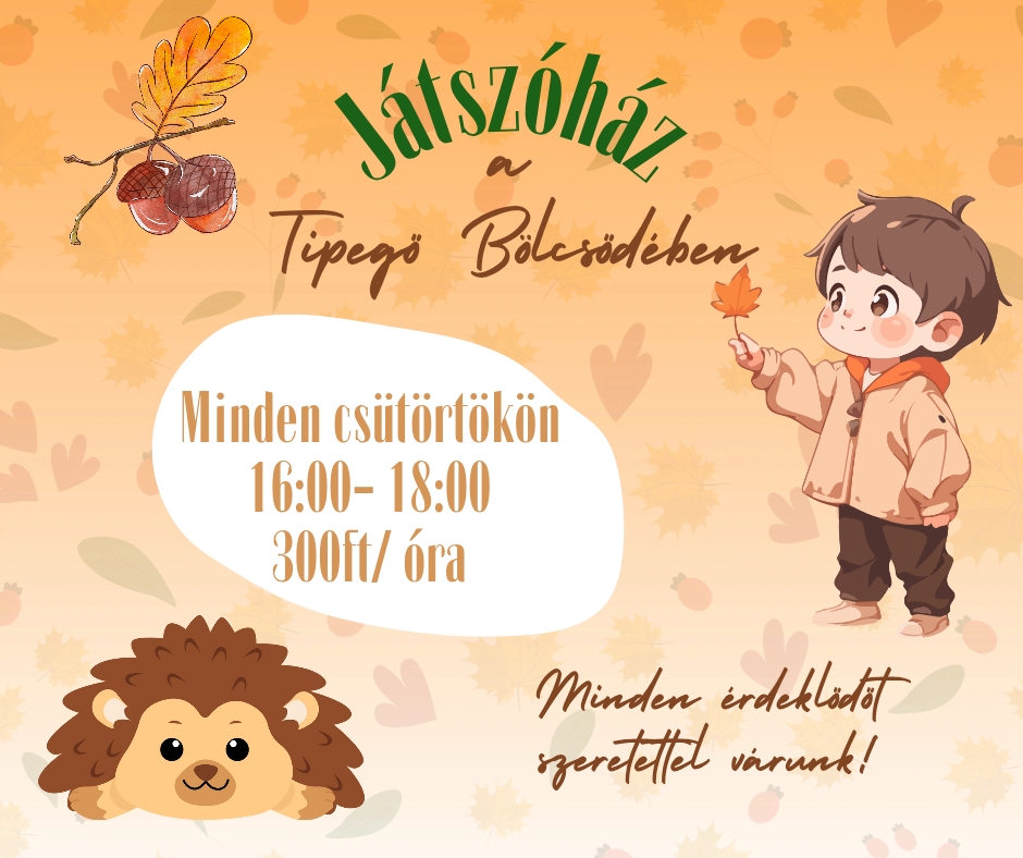 Bölcsődénk játszóháza mindenki előtt nyitva áll csütörtökönként 16-18 óra között.Lehetőség van felfedezni az egész bölcsődét és megismerkedni a kisgyermeknevelőkkel. Jó idő esetén az udvaron, hűvösebb időszakokban pedig a csoportszobákban próbálhatják ki a gyermekek a játékokat. A játszóház nagy előnye, hogy a leendő bölcsődések még a beszoktatás előtt ismerkedhetnek a környezettel, a kisgyermeknevelőkkel, miközben a szülők információkat kaphatnak a bölcsődei élettel, napirenddel, beszoktatással kapcsolatban.A játszóház díja: 300 Ft/óraSok szeretettel várunk minden érdeklődőt!